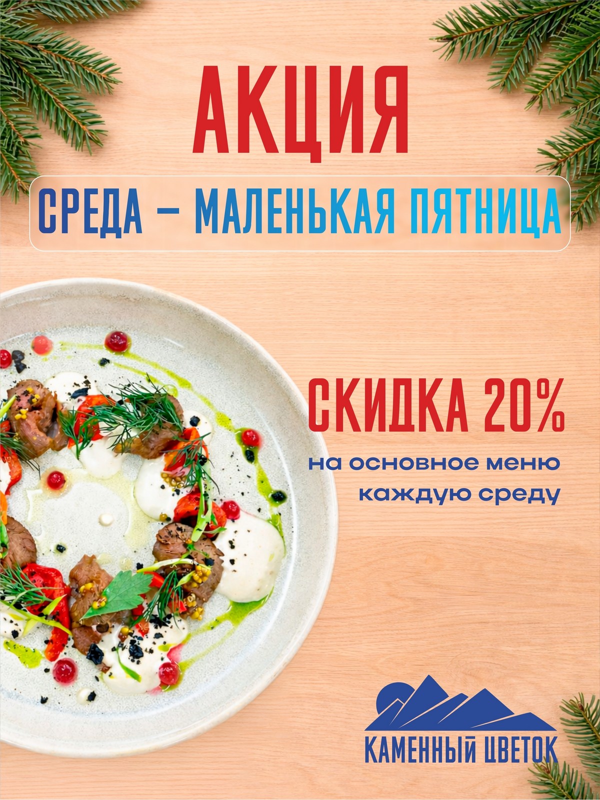 - По средам — 20% скидка на всё основное меню! Любимые блюда стали еще доступнее.