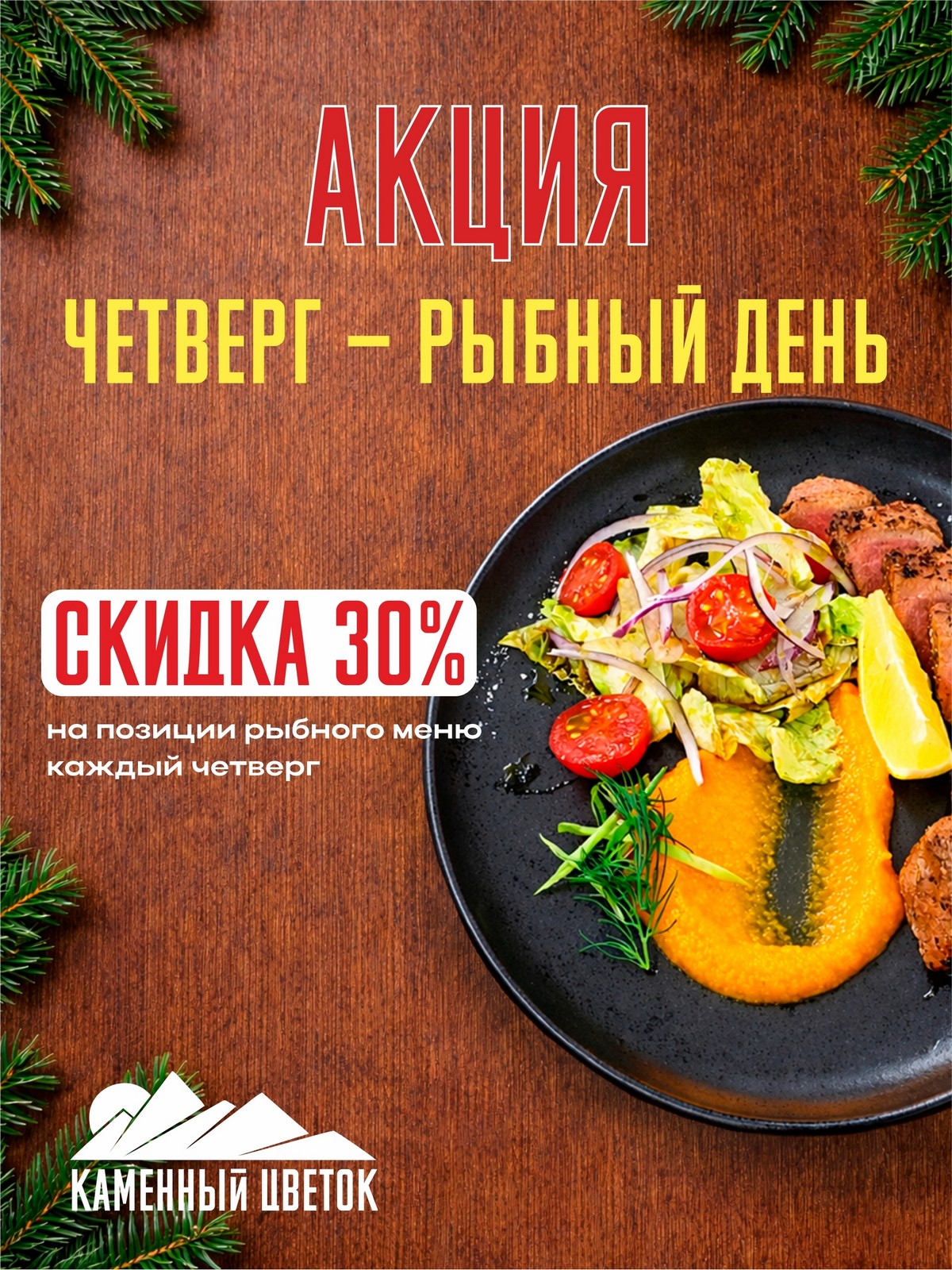 - По четвергам — специальное предложение 30% на всё рыбное меню! Отличный повод порадовать себя свежими и ароматными блюдами.